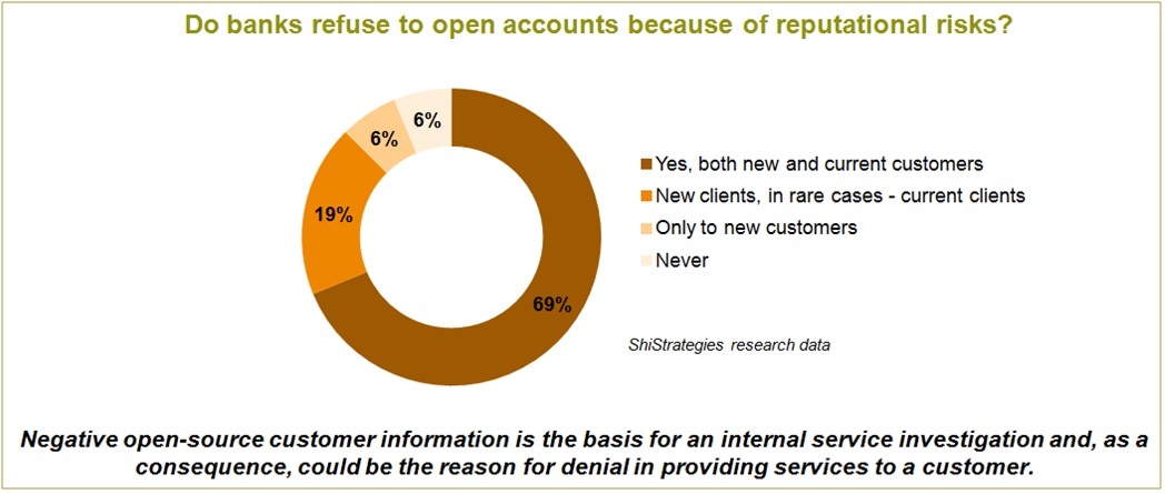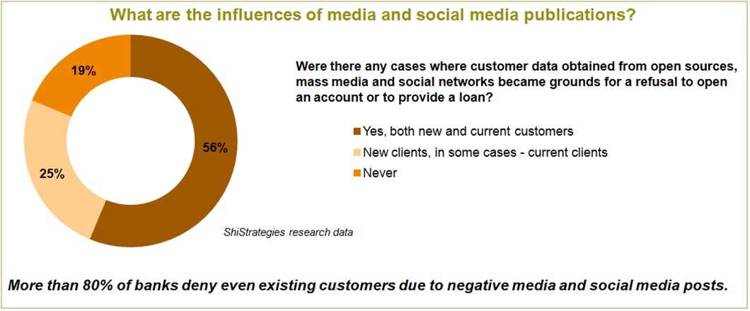 As it turned out during the study, most banks can refuse to service even valid customers due to negative publications in the media and social networks.