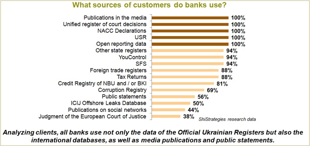 Besides, banks monitor sources outside Ukraine. In particular, 88.7% of respondents collect data in trade registers of foreign countries. Half of the banks use the information of the international database of offshore companies ICIJ Offshore Leaks Database, 38% follow the decisions of the European Court.