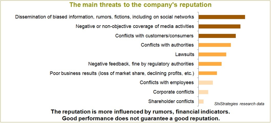 As you can see, the reputation of companies and banks is more influenced by the distribution of negative and biased information and rumors than unsatisfactory business results. At the same time, many companies and banks do not pay due attention to working with the media, communications with target audiences, during which a positive attitude towards their activities is formed. As practice shows, good performance does not guarantee a good reputation. Work without communication leads to rumors, speculation, which, according to the companies themselves, is the main threat. Therefore, it is so important to move from the practice of spontaneous formation of reputation to systemic management of it.