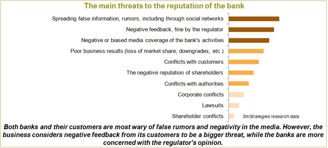 We asked representatives of financial institutions and their clients to rate on a 10-point scale the factors that most threaten their reputation. Both banks and businesses put the distribution of biased information and rumors in the first place, including in social networks. At the same time, the negative financial results in the list of reputation risks among banks fell only in fourth place, and among customers only in seventh.